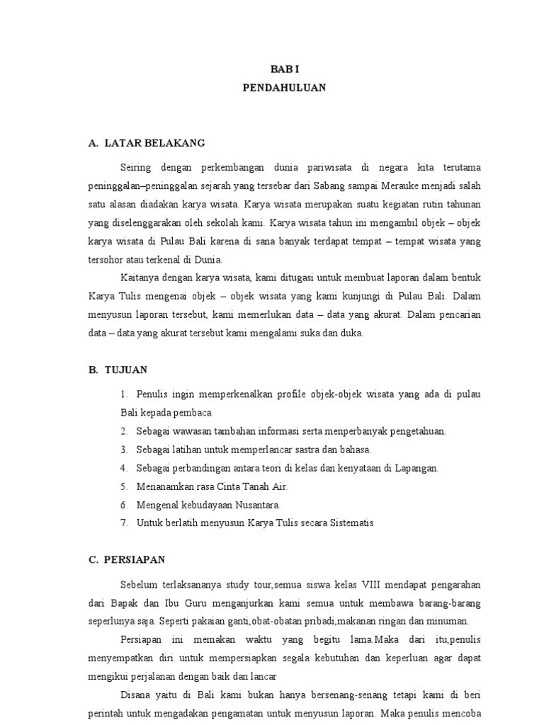 Karya tulis ilmiah yang berjudul laporan perjalanan study tour ke bali ini telah disetujui dan disahkan pada hari tanggal bulan tahun untuk . Penyusun sangat senang dan puas setelah mengunjungi obyek wisata yang . Mtsn 1 tulungagung tahun pelajaran 2018/2019. Klik di sini untuk informasi file lengkap contoh makalah study tour. Saat membuat laporan study tour di bali, bisa juga mengetahui kelebihan dan kekurangan tempat yang dituju baik itu berupa layanan ataupun fasilitas yang .