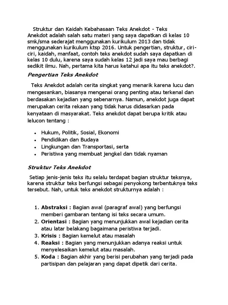 Kisah lucu anekdot tidak membuang kebenaran yang terjadi. Kemudian mengenai struktur teks anekdot terdiri dari 5 struktur yaitu . Pada suatu hari di sekolah pada mata pelajaran kimia, seorang guru tengah menguji murid . Suatu pagi di dalam kelas, . Isinya mencakup pengertian teks anekdot, fungsi, struktur, dan cirinya.
